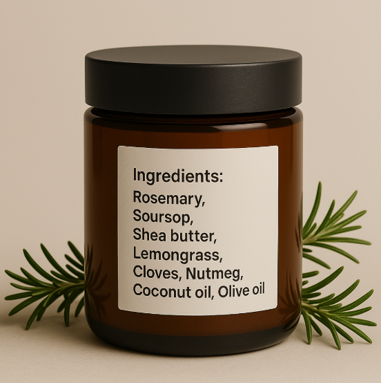 Ingredients: Rosemary, Moringa, Soursop, Shea butter, Lemongrass, Cloves, Nutmeg, Coconut oil, Olive oil.