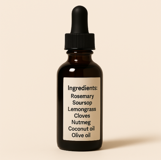 Ingredients: Rosemary, Moringa, Soursop, Lemongrass, Cloves, Nutmeg, Coconut oil, Olive oil.